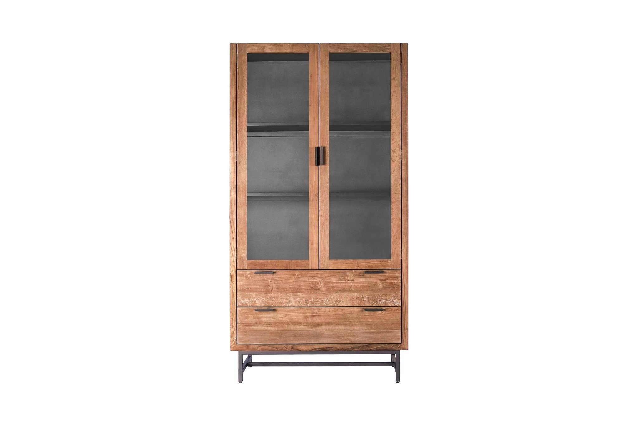 Cette élégante vitrine allie la chaleur du bois à la modernité de son piètement en métal. Dotée de portes vitrées et de tiroirs spacieux, elle offre un espace d'exposition et de rangement optimal. Elle s'intègre parfaitement aux intérieurs modernes et industriels.