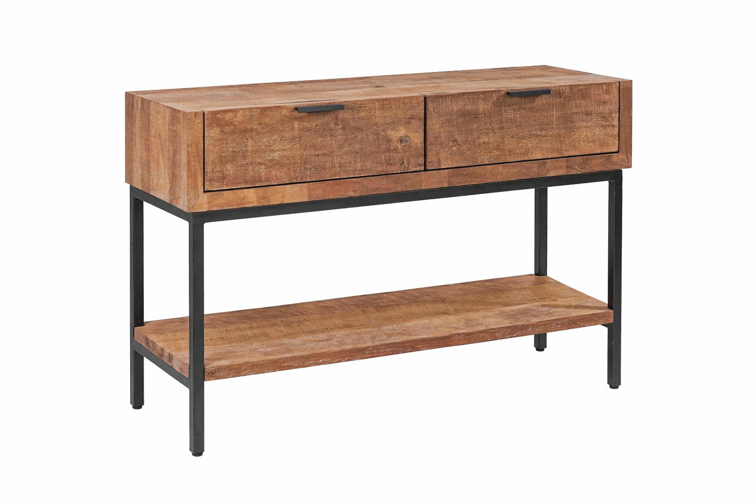 Cette élégante table d'appoint en bois allie un aspect chaleureux et naturel à un piètement en métal moderne. Dotée de deux tiroirs et d'une étagère inférieure supplémentaire, elle offre un espace de rangement pratique. Elle s'intègre parfaitement dans le Lire plus