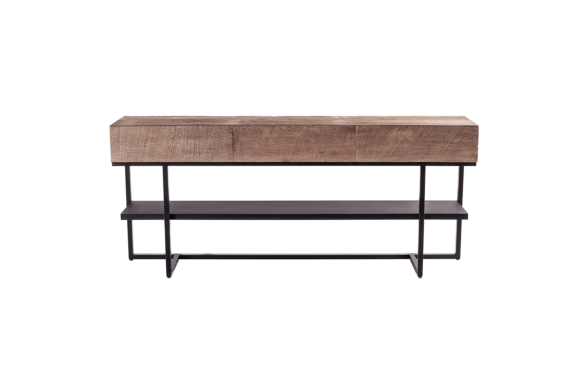 Cette table d'appoint spacieuse allie la chaleur du bois à l'élégance d'une structure métallique pour un style industriel et moderne. Dotée de trois tiroirs et d'une étagère inférieure pratique, elle offre un espace de rangement supplémentaire. Idéale pour l'entrée, le salon ou derrière le canapé.