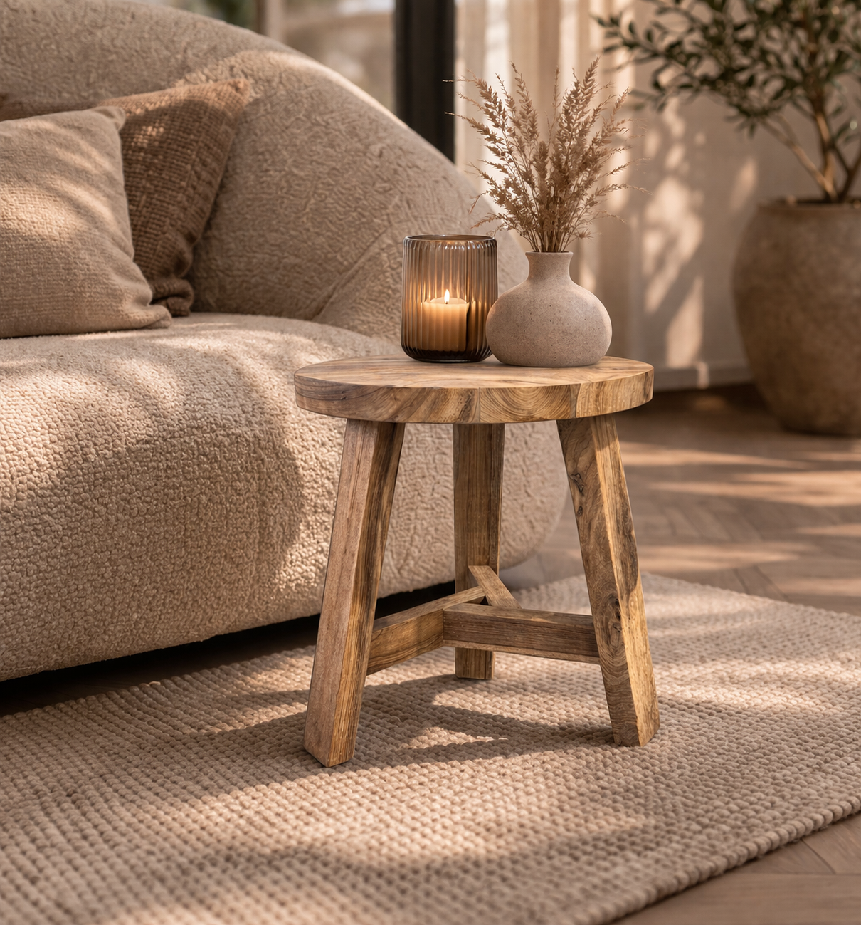 Ce tabouret élégant en bois massif allie fonctionnalité et esthétique chaleureuse et naturelle. Grâce à son plateau rond robuste et à ses pieds solides, il est idéal comme table d'appoint, élément de décoration ou siège supplémentaire. Lire plus