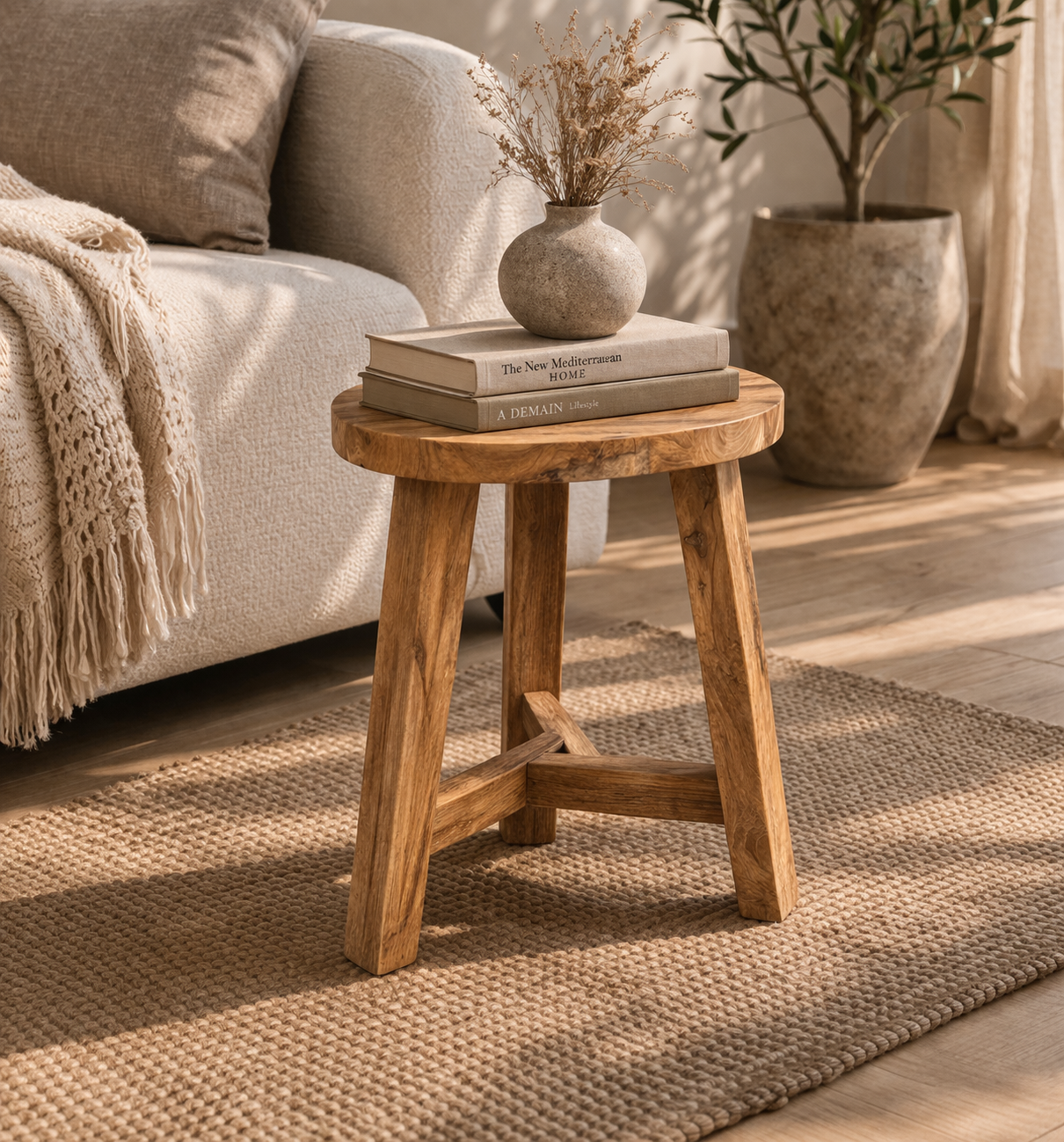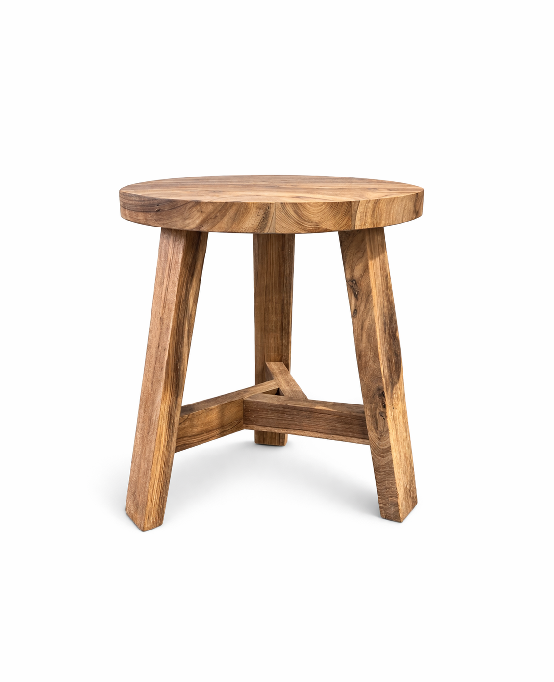 Ce tabouret élégant en bois massif allie fonctionnalité et esthétique chaleureuse et naturelle. Grâce à son plateau rond robuste et à ses pieds solides, il est idéal comme table d'appoint, élément de décoration ou siège supplémentaire.