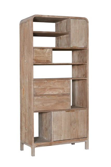 Deze stijlvolle houten open kast combineert opbergen en presenteren in één. Met meerdere vakken, lades en deuren biedt hij ruimte voor boeken, accessoires en servies. De warme houtlook past perfect in moderne en landelijke interieurs.