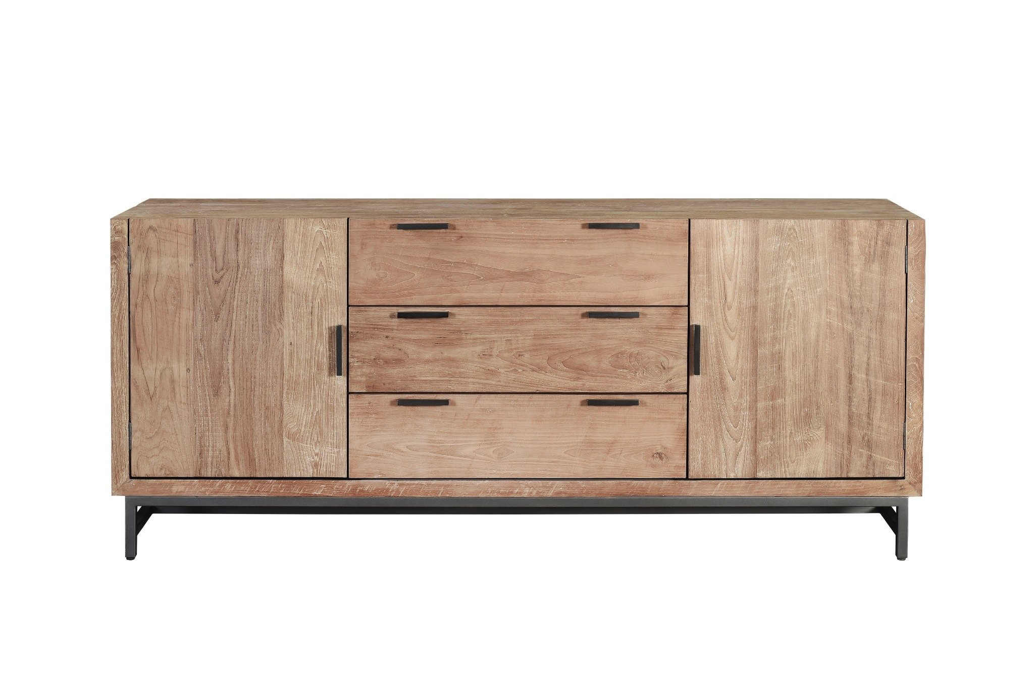 Dit stijlvolle houten dressoir combineert een warme, natuurlijke uitstraling met een modern metalen onderstel. Met meerdere lades en kastdeuren biedt het ruime opbergmogelijkheden. Past perfect in zowel moderne als industriële interieurs.
