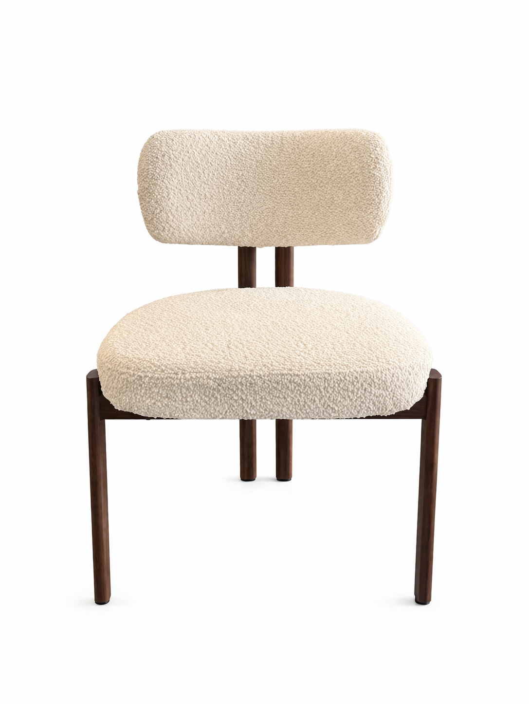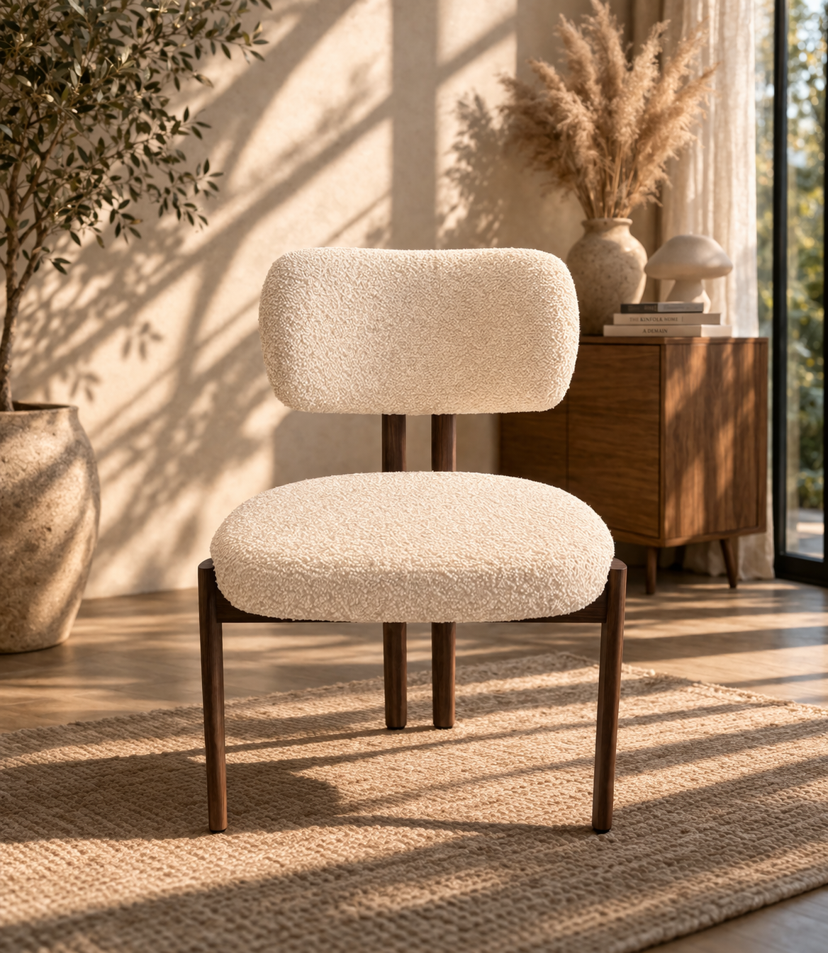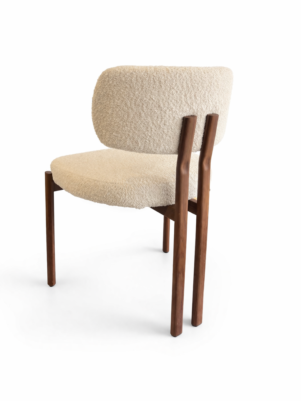 Breng warmte en elegantie in je interieur met deze stijlvolle eetkamerstoel in zachte bouclé stof. De combinatie van het afgeronde ontwerp, de luxe textuur en het slanke houten frame zorgt voor een tijdloze uitstraling die perfect past in zowel moderne als Scandinavische woonstijlen.