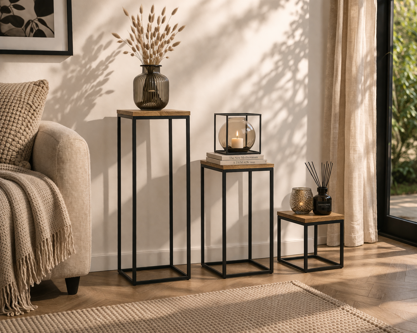 Dit moderne bijzettafeltje combineert een warm houten blad met een strak zwart metalen frame voor een stoere industriële uitstraling. Dankzij het compacte formaat is het ideaal naast de bank, fauteuil of bed voor het neerzetten van een lamp, boeken of accessoires. Een praktische én stijlvolle toevoeging aan elk interieur.